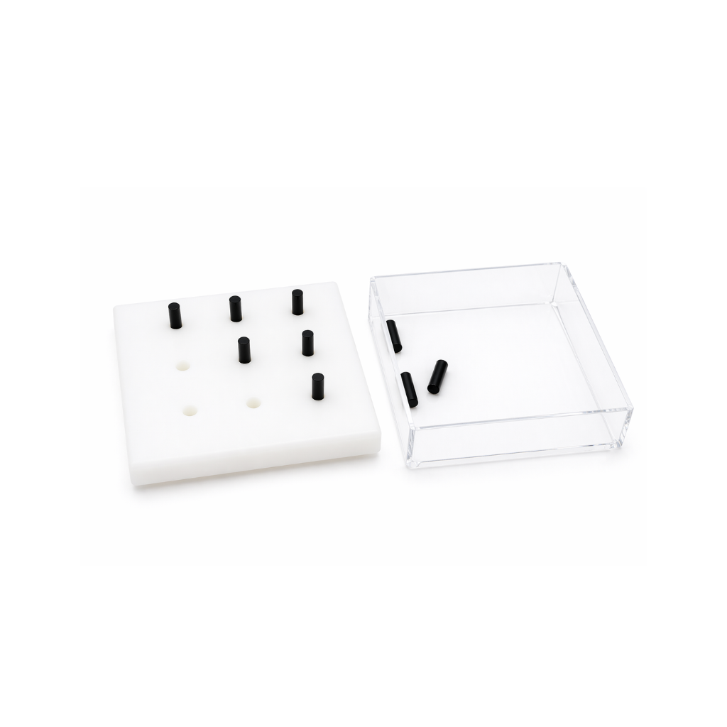 Die Platte besteht aus einer kompakten Grundplatte mit neun Bohrungen sowie 9 Stiften und einem Deckel.