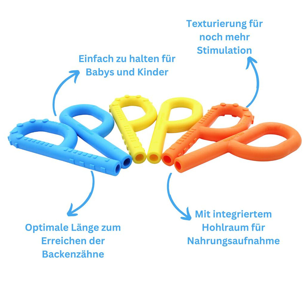 Der P Tube leistet weniger Widerstand beim Kauen und ist somit perfekt für Personen mit geringer Kieferkraft, oder die ein Kauspielzeug bevorzugen, das mehr zusammenfällt. Darüber hinaus ermöglicht die röhrenähnliche Form, dass sowohl pürierte, als auch feste, längliche Lebensmittel in diese gegeben werden können. Auf diese Art kann das funktionelle Beißen und Kauen geübt werden.