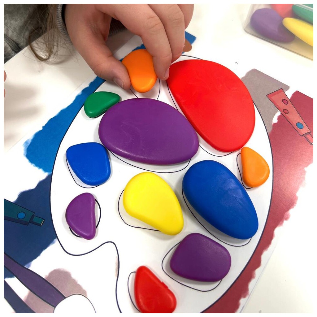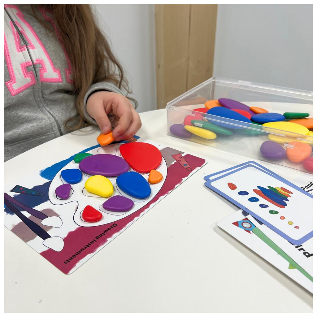 Die Kleinen beginnen mit dem Sortieren und Benennen der Farben. Den richtig großen Stein zu finden und so zu drehen, dass er auf die großen Vorlagen-Motivkarten passt ist der nächste Schritt. Anhand kleiner Vorlagenkarten können schließlich verschiedene Figuren frei auf dem Tisch gelegt werden. Beim Stapeln ist Fingerspitzengefühl gefragt, damit die Steine in Balance bleiben. Darüber hinaus können die Regenbogen Kieselsteine auch für Zähl- und Rechenaufgaben verwendet werden. Diese tolle Sammlung ist die perfekte Ergänzung für jedes Kinderzimmer!