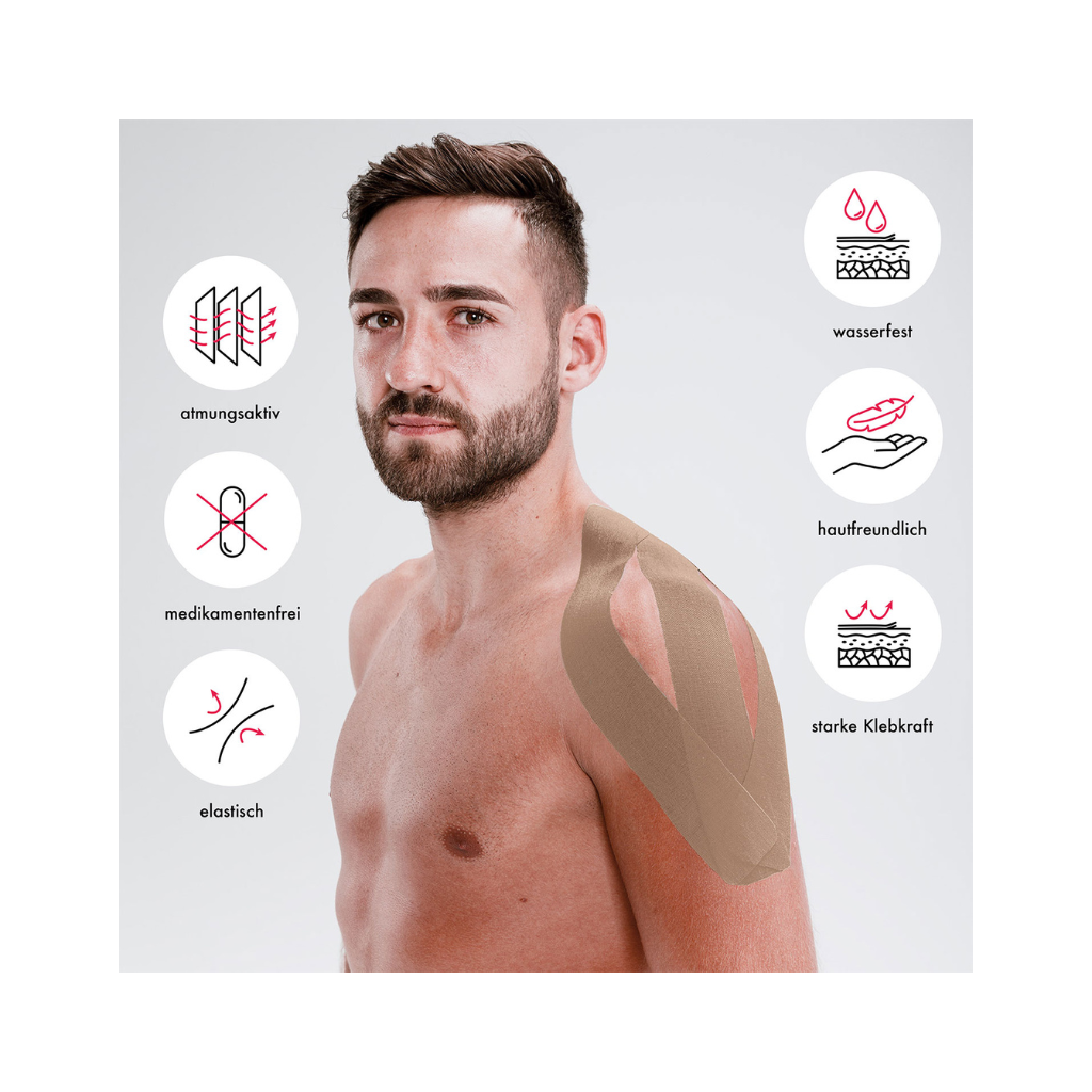 Schwimmen, baden, duschen oder Sport treiben ist mit dem Verband problemlos möglich. Das atmungsaktive Material des Tapes lässt schwitzen zu und erlaubt der Haut darunter zu atmen.