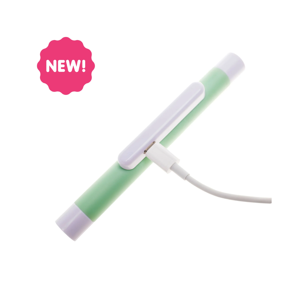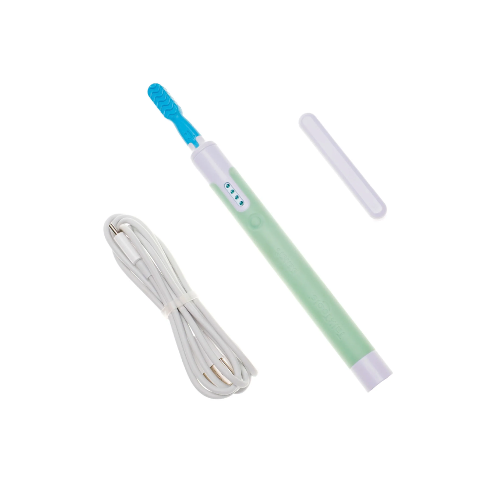 Das Handgerät verfügt über ein ergonomisch geformtes Gehäuse mit integrierter, wiederaufladbarer Lithium-Batterie. Der Aufsatz besteht aus weichem, frei von Latex, BPA, Blei und Phthalaten hergestelltem Material.