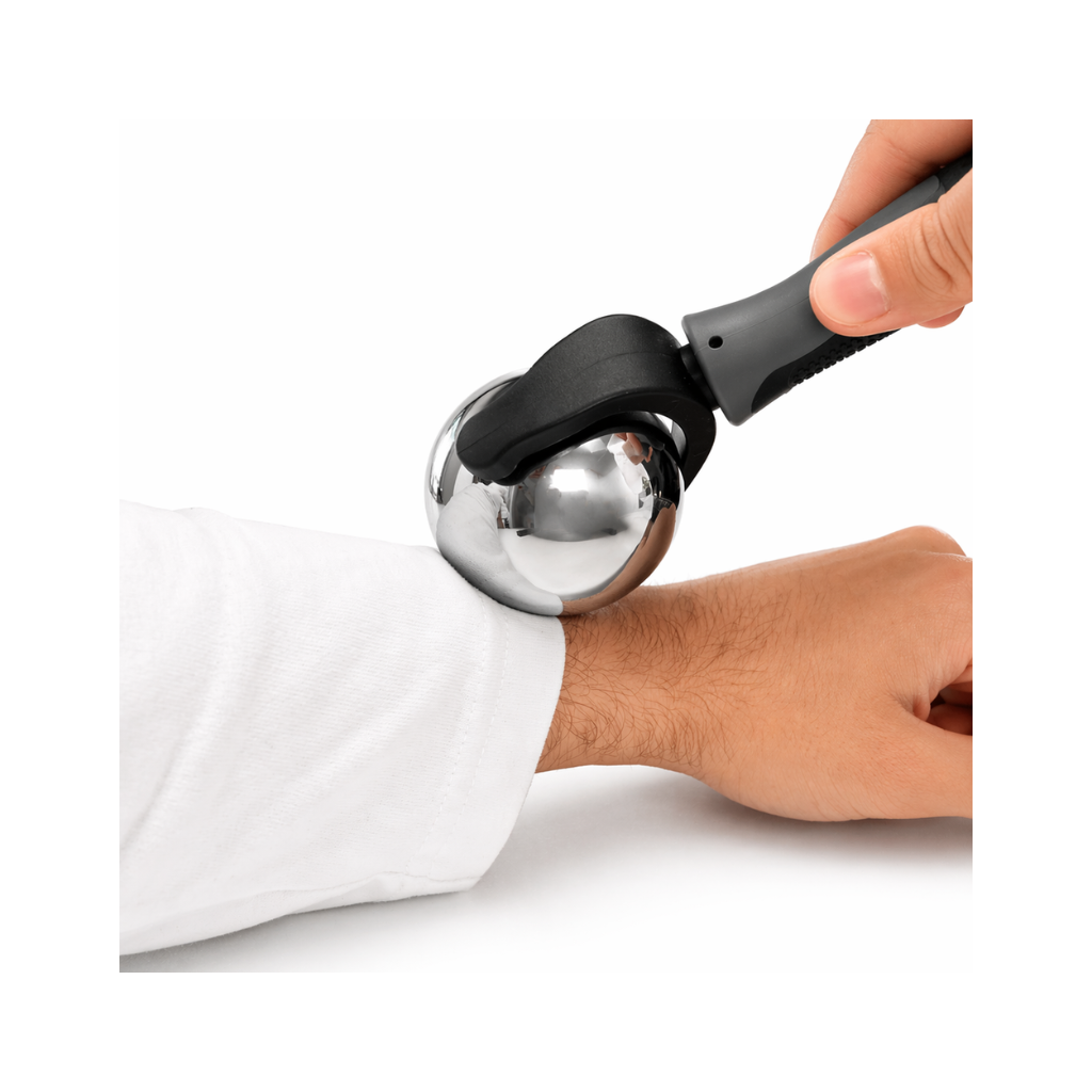 Die rollende Massagerfläche ist für eine gleichmäßige Bewegung über die Haut konzipiert. Das Produkt ist für die manuelle Anwendung vorgesehen und kann im Rahmen von Kälteanwendungen vorbereitet werden.