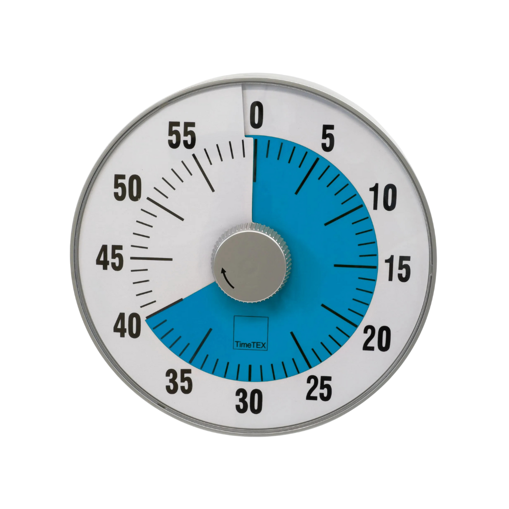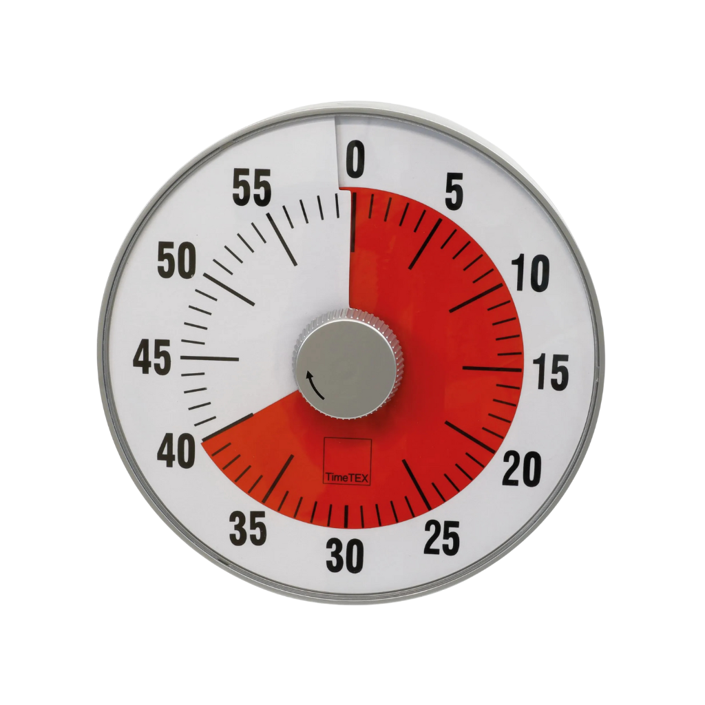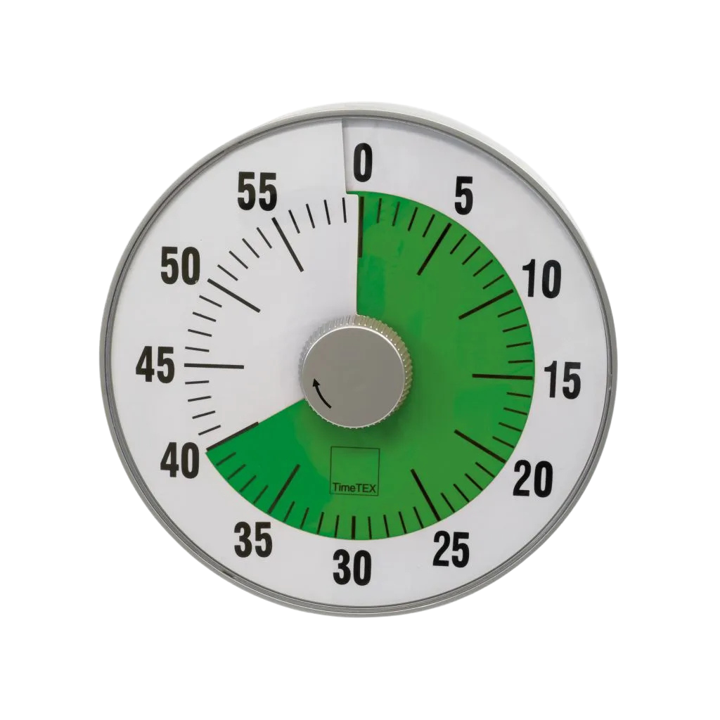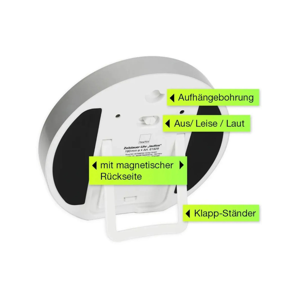 Die TimeTEX Zeitdauer-Uhr „lautlos“ L mit 19 cm Durchmesser kombiniert visuelle Klarheit mit praktischer Funktionalität – für konzentriertes Arbeiten in Schule, Alltag und strukturierten Lernsituationen.